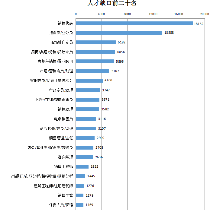 2018年第三季度,广西人才网联系统中业务类人才紧缺,在用人单位最急需人才的前二十名具体职位中,有八成职位与业务挂钩,其中销售代表、推销员/业务员、市场推广专员等职位分列前三名,这三个职位的人才缺口(即需求人才数与求职人才数的差额,下同)分别达到18132人、13388人及6182人。