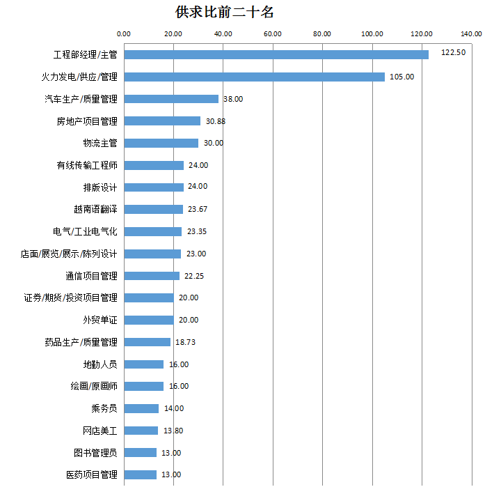 2018年第三季度,在人才竞争激烈程度的具体职位排名中,工程部经理/主管(属房地产开发类)和火力发电/供应/管理职位分列前两位,由于需求极少,这两个职位的人才供求比分别达到122.50105.00,均超过100人竞争1个岗位。