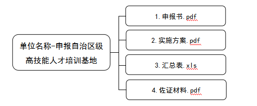 3.申报单位请将申报材料按顺序排列放入一个文件夹(如图所示),制成压缩包后,命名为“单位名称-申报自治区级高技能人才培训基地”,发送至指定邮箱。