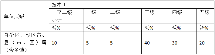 工勤技能岗位的最高等级和结构比例按照岗位等级规范、技能水平和工作需要确定。技术工岗位类别结构比例不分单位层级,自治区、设区市、县(市、区)属(含乡镇)农业农村事业单位统一使用以下岗位结构比例指导标准: