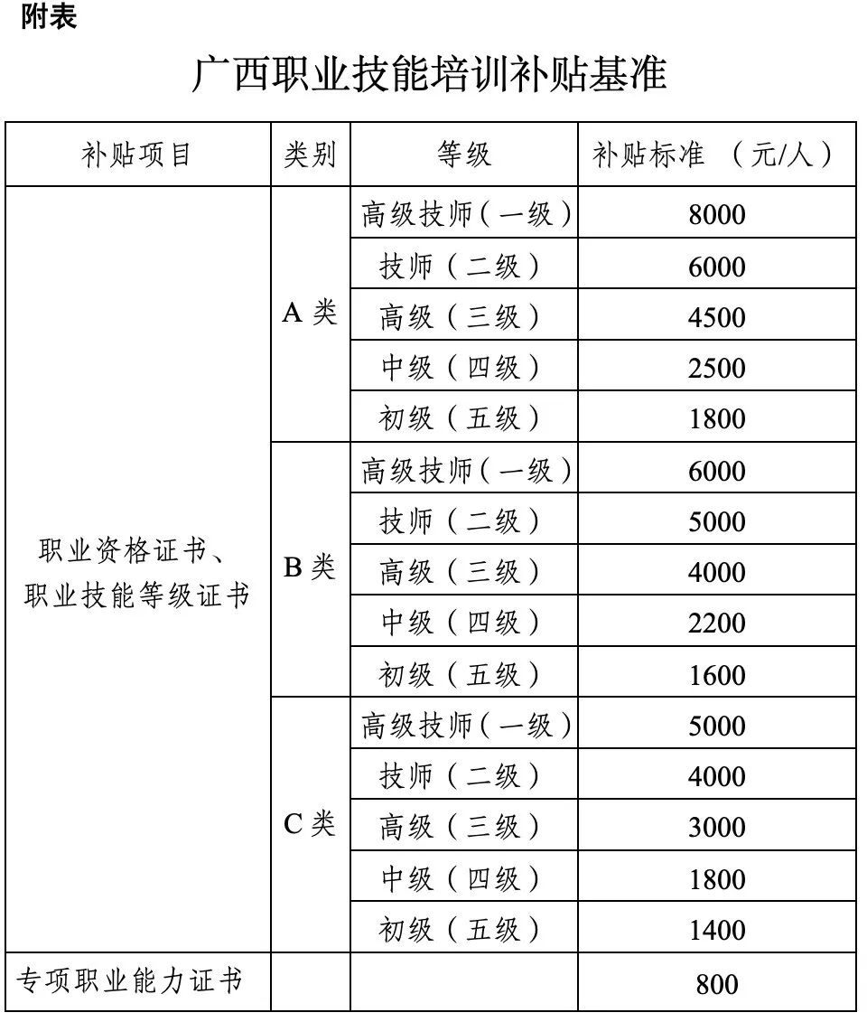 六类人员参加目录内职业培训机构组织的就业技能培训,并通过职业技能评价取得职业技能类证书(包括职业资格证书、职业技能等级证书、专项职业能力证书),按照广西职业技能培训补贴基准(见附表)给予就业技能培训补贴。