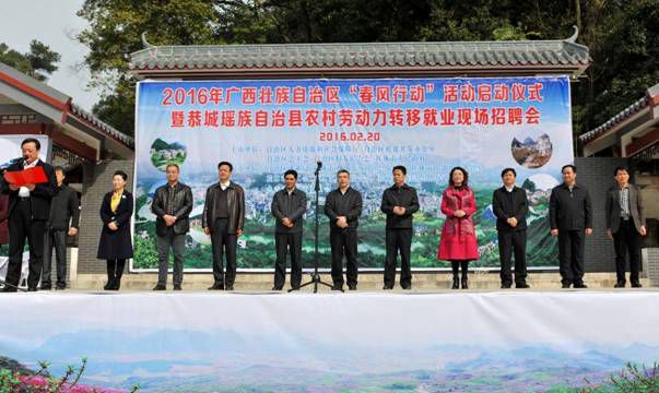 2016年2月20日,由自治区人力资源和社会保障厅、自治区扶贫办、自治区总工会和自治区妇联、桂林市人民政府主办,桂林市人力资源和社会保障局、桂林市扶贫办、桂林市总工会、共青团桂林市委、桂林市妇女联合会、自治区就业局和恭城瑶族自治县人民政府承办的2016年“春风行动”启动仪式在桂林市恭城瑶族自治县文武广场举行。自治区人力资源和社会保障厅副厅长黄智宇、自治区扶贫开发办公室副巡视员朱有奎,自治区总工会副主席元德新、自治区妇联副主席吴晓丽等领导参加启动仪式。
