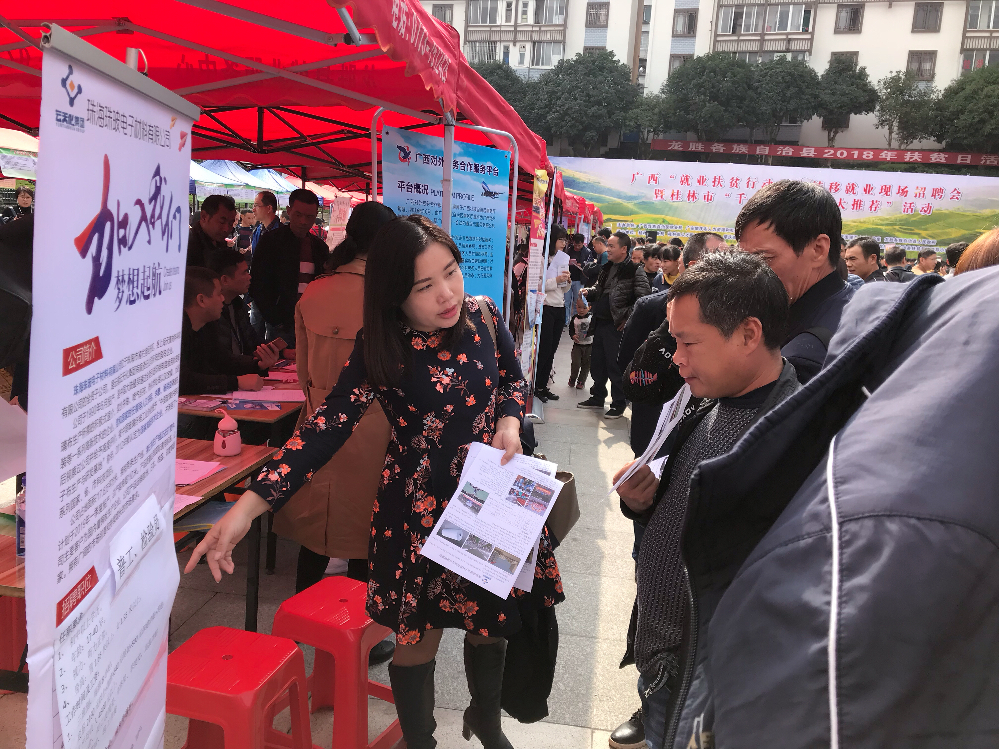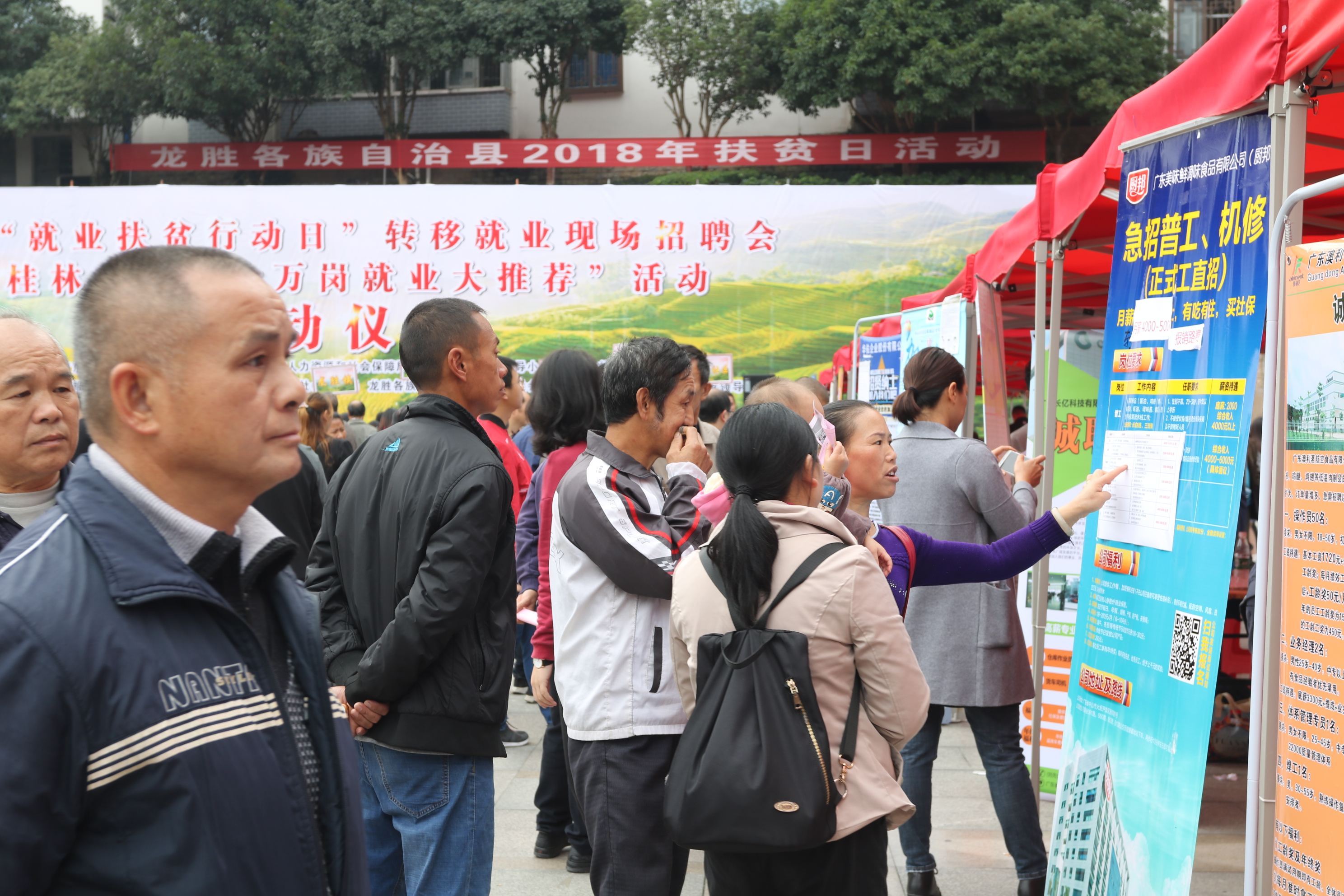 今年10月17日是第五个全国扶贫日,为贯彻落实党中央、国务院关于打赢脱贫攻坚战三年行动的指导意见和打赢人力资源社会保障扶贫攻坚三年行动方案,配合做好全国扶贫日活动,深入推进就业扶贫工作。10月17日当天, 广西“就业扶贫行动日”转移就业现场招聘会暨桂林市“千企万岗就业大推荐”活动在桂林龙胜各族自治县举办。